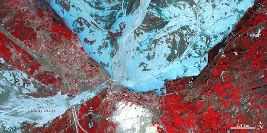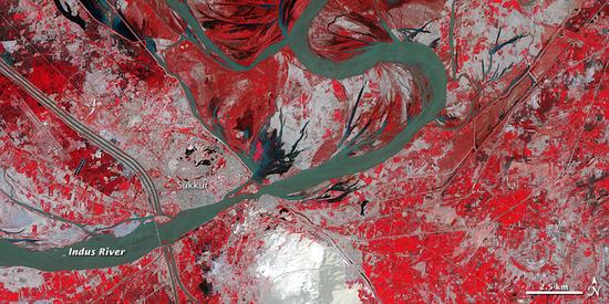 NASAren irudiak dira. Beste eskala urrutiagoko batean hartutako honetan ere agerikoa da nola hazi den Indo ibaia.
