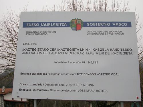 Kartelak Jaurlaritzaren Hezkuntza, Unibertsitate eta Ikerketa Sailaren logoa du, eta eliza ondoan dago.