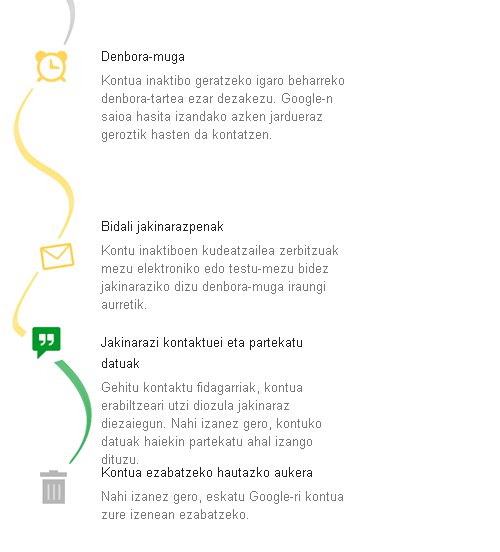 Data batzuk adierazi ditzakezu, eta Googlek jakinarazpenak bidaliko ditu zuk zeuk emandako aginduen arabera (nori, noiz, zer...). Ondorengo urrats batean, zure informazio guztia beste erabiltzaile bati bidaltzeko aukera dago, zure informazioa ezabatzekoa, edo Googleren esku uztekoa. Hemenditik konfiguratzen da: Inactive Account Manager.