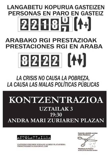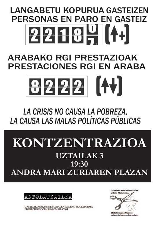 Gasteizko Gizarte Eskubideen Aldeko Plataformak eman dituen datuen arabera, muturreko txirotasuna 2008an biztanleriaren % 3,8koa izatetik 2012an %5,6koa izatera igaro da, hots, gure hirian 15.000 pertsona bizi dira pobrezian. Horrez gain, Gasteizko lau familiatik hiruk azken 5 urteotan krisiarekin erlazionatutako egoeraren bat bizi dute (lanik ez izatea, ohiko aisialdiko gastuei uko egin behar izatea edo, oro har, hilaren amaierara iristeko arazo ekonomikoak izatea)