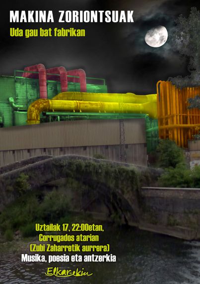Elkar-ekin taldearen eta Azpeitiko hainbat sortzaileren elkarlanaren fruitua da ostiral honetan aurkeztuko dugun ikuskizuna: Makina Zoriontsuak. Zota ostiralean da, uztailak 17, 22.00etan, Azpeitiko Corrugados lantegiaren atariko oholtzan.
