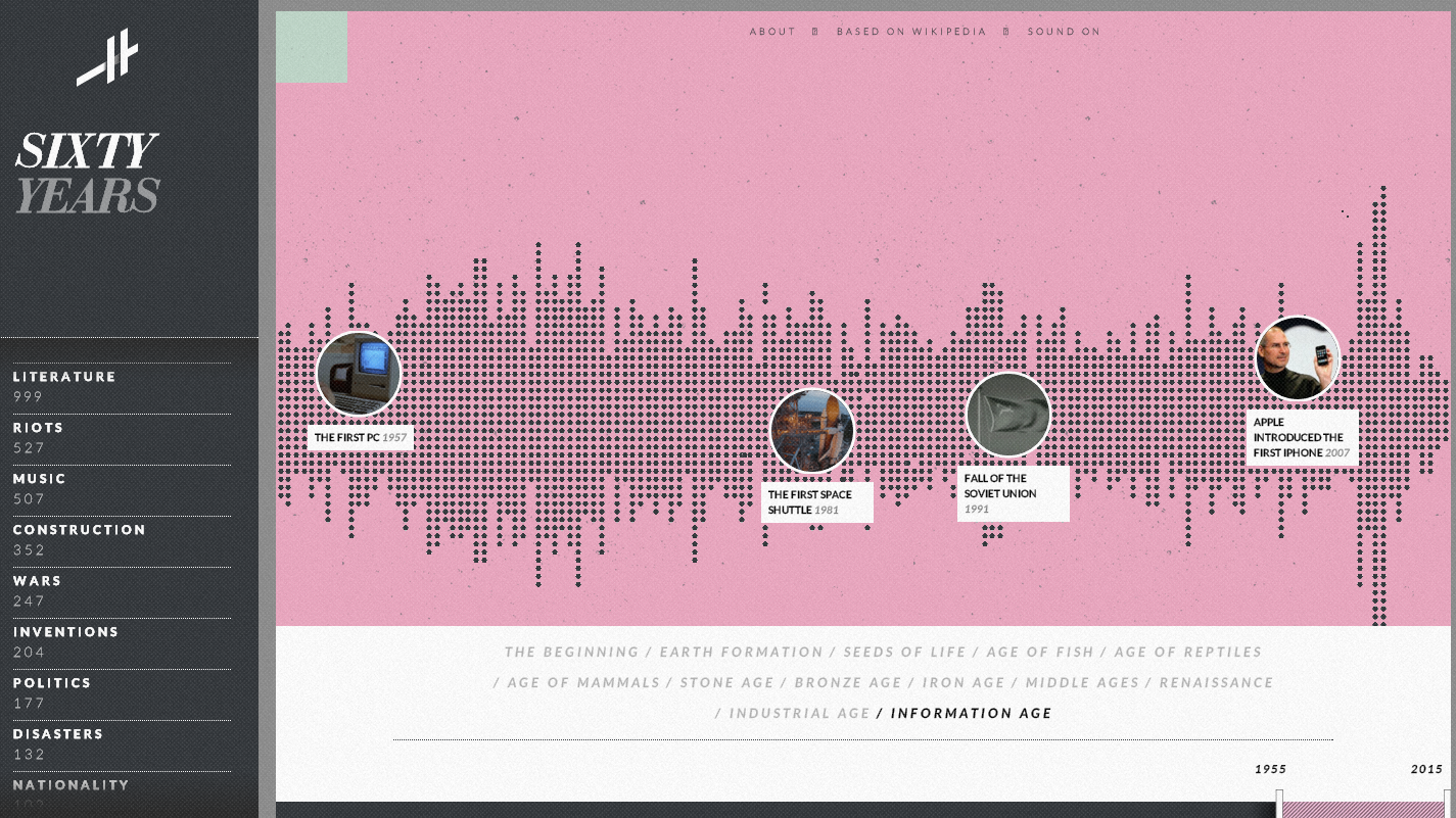 Big Bang-arekin hasi eta azken gertakari historikoetaraino, Wikipedian azaltzen diren une historiko guztiak bildu dituzte infografia interaktiboan. Unibertsoaren historia, gure planetarena, gizakiarena,... Puntu bakoitza gertakari bat da. Datuak Wikipediatik jasotzen ditu eta automatikoki eguneratzen dira.