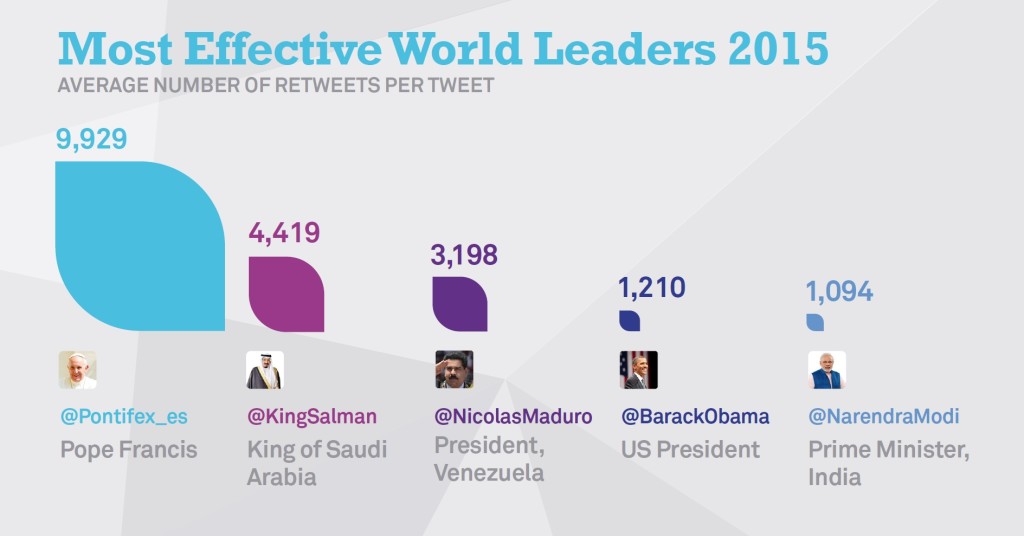 Twiplomacy ekimenak bere urteroko laburpena argitaratu berri du (2015eko datuekin). Munduko liderrek Twitterren daukaten jarduna aztertzen dute urtero-urtero, jarraituenak eta eraginkorrenak zeintzuk diren aztertuz, estatistikak argitaratuz, eta abar. Aurtengoan, gainera, beste plataforma eta sare sozial batzuk ere aztertu dituzte (Youtube, Facebook, Instagram, LinkedIn, G+ eta Vine). Hona hemen, sare sozial nagusietan lider diren munduko liderrak.