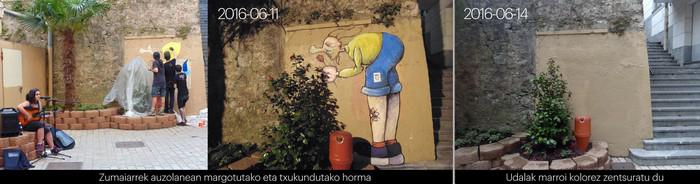 Zumaiako horma bazter bat street-art adibide polit batekin margotu zuten duela gutxo. Baina "Zumaiako udal-gobernuari ez zaio gustatu herritarrek herriari musutruk egindako oparia. Erribera kaleko horma itsusi bat artelan batekin edertu ondoren, bi egun ere ez ditu iraun." Beste kasu bat ere salatu dute, haurren lan eta margolan batzuekin egindakoa.
