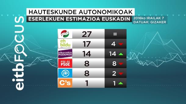 EAJk irabaziko lituzke Eusko Legebiltzarrerako hauteskundeak datorren irailaren 25eko hauteskundeetan; EH Bildu koalizioa izango litzateke bigarren indarra, eta Elkarrekin Podemos, hirugarrena. PSE-EEk eta PPk atzera egingo lukete, zortzina legebiltzarkide lortuta, eta C’s Gasteizko Ganberan sartuko litzateke estreinakoz, ordezkari batekin. EiTB Focusek I25erako boto-asmoari buruz egindako galdeketak utzitako emaitzak dira.