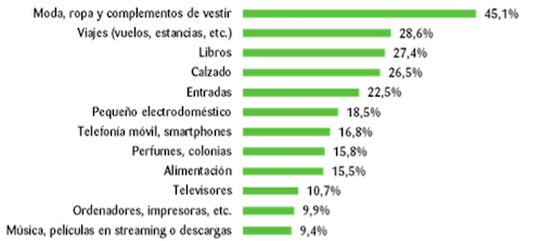 Merkataritza Behatokiaren inkestak erakusten duenez, 18 eta 40 urte bitarteko lau lagunetik hiruk eskuarki erosten dute Internetez, eta modako produktuak edo osagarriak dira gehien erosten direnak, kasuen %45ean hain zuzen; atzetik dator bidaien sektorea, %28,6ko portzentajearekin. Liburuak eta oinetakoak hirugarren eta laugarren postuetan daude (%27 eta %26 hurrenez hurren), eta elikagaiak erosketen %15 dira.