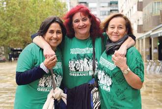Ingurukoen babes mezuak idatzita dituzte euren borrokaren ikur izan diren kamiseta berdeetan. Urte eta erdiko greba deialdien ostean, heldu da kamisetak eranzteko ordua, enpresekin akordiora heldu baitira. Aldundiak kontzertatutako egoitzetako zaintzaileak edo gerokultoreak dira, ELAkoak. Durangoko Barandiaran egoitzan lan egiten dute Ereñagak eta Pedrosak, eta Astarloan Ariznabarretak.