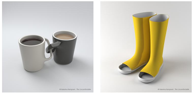 Katerina Kamprani arkitekto greziarra da, eta objektu-diseinua ere egiten du. Alor honetan, bilduma zoragarri bat sortu du: Objektu deserosoak. Batzuk 3-D modelo birtualak dira, baina beste batzuk prototipo mailara igaro dira; hau da, benetan fabrikatu dituzten objektuak dira,