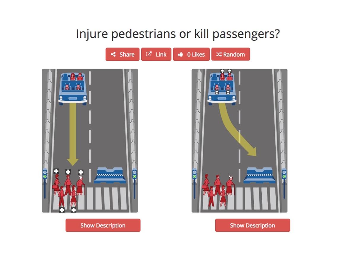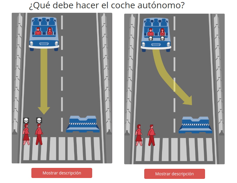 Ezkerreko aukeran, kotxeak aurrera egiten du eta bi oinezkoak harrapatu eta hilko ditu. Eskuineko aukeran, autoa desbideratuko da eta barreraren kontra joaz, bi bidaiariak hilko ditu. Eskema sinplista da nahita: ez dago aukera balaztatzen saiatzeko, edo pentsatzeko barrerarekin joaz istripua arina izango dela... Ez: grafikoak burezurrak erakusten dizkizu eta horrek esan nahi du aukera batean bi hiltzen direla, eta bestean ere bi. Ez dago tartekorik edo salbaziorik: aukeratu egin behar duzu nor hil.