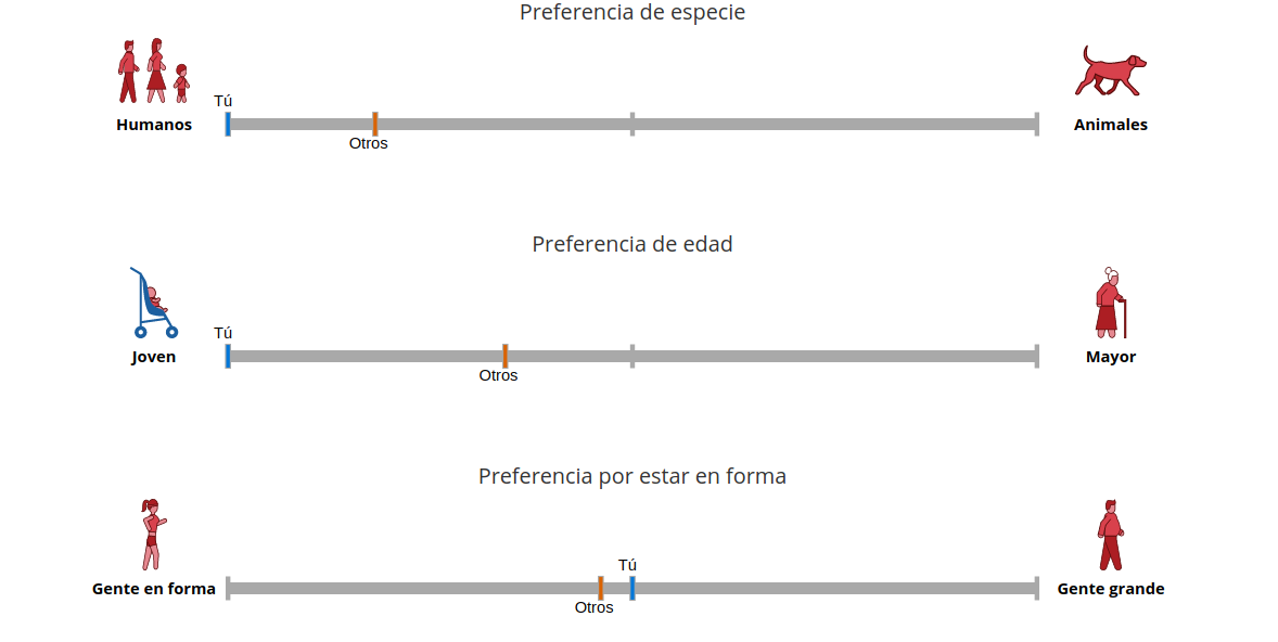 Txandaren amaieran, inkesta bat bete dezakezu zure profila adierazteko, edo hori barik emaitzak aztertzera pasa zaitezke. Orduan, erakusten dizu ze joera duzun "erabaki ertainekin" alderatuz. Adibidez, honako irudi honek adierazten du testa egin duen Sustatuko editoreak joera handiagoa duela jendea salbatzeko, neurri ertaina baino (txakurrak salbatzeko joera ere badago erabiltaileen artean). Haurrak nagusien gainetik salbatzeko joera ere badu editoreak, baina hortxe, besteak bezala, jendearen fitness egoerari buruz.