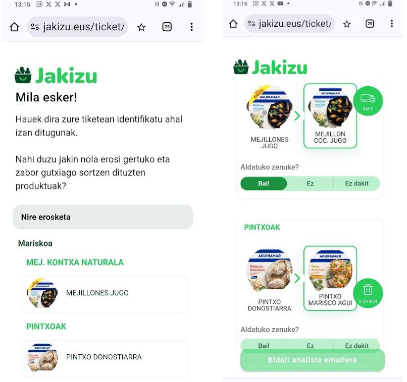 Tiketa aztertuz, erosketan zenbat jaki diren bertakoak, nolako zaborra sortzen duten, eta zein izan daitekeen erosketa jasangarriagoa iradokitzen dizu aplikazioak. Gainera, erabilterraztasunaren aldetik, ez da berez app instalazio bat eskatzen duen ezer: Jakizu.eus bisitatu eta Eroskiko erosketa tiketa baduzu euskara, mugikorraren bidez hari argazkia ateratzeko proposatuko dizu sistemak.