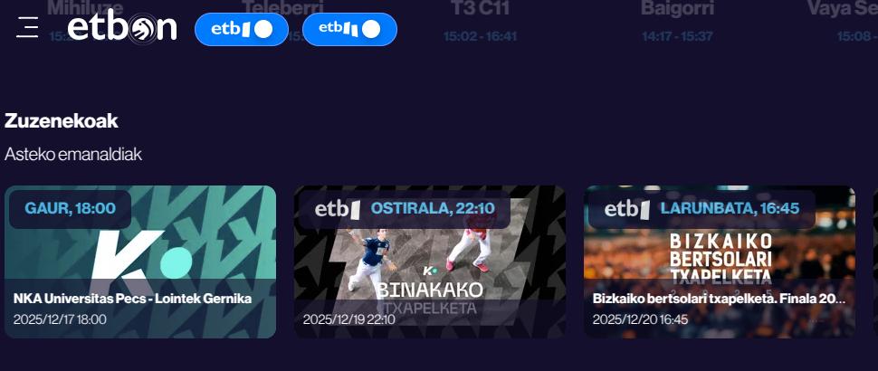 Baina gehikuntzarik ere badu ETB On-ek: zuzenekoak plataformatik. Halakoekin egin dira saiakera Primeran-en bitartez, baina EITBk esan duenez, "EITBren zuzeneko guztiak ez ezik, euskal gizartearentzat garrantzitsuak diren aktualitate-ekitaldien zuzeneko berezienak ikusteko aukera izango da." Eta zuzeneko horietan kirol eskaintza indartuko da, kirol ez profesionalak barne, eta "asteburuko emankizunetan askotariko leihoez osatutako pantaila aurkeztuz".