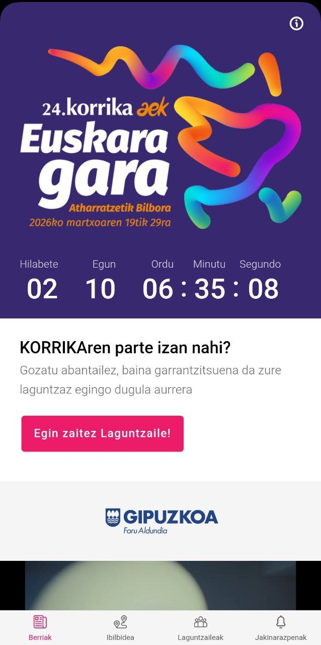 Gaur goizean jakinarazi dute Korrikaren ibilbide eta egutegi zehatza. Martxoaren 19tik 29ra izango dela bagenekien, eta Atharratzetik Bilbora doala euskararen aldeko ekimena ere bai, baina tarteko ibilbidea gaur egin da publiko. Korrika aplikazioa dutenek jaso dute lehen abisua horrena. Hain zuzen ere, aplikazioa berritu egin dute aurtengo ediziorako, eta informazioa beste toki batzuetan baino lehenago jasotzeaz gain, zozketak antolatu dituzte app-a instalatuta dutenen artean.
