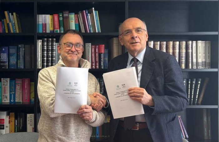 Udako Euskal Unibertsitateak eta Euskaltzaindiak lankidetza-hitzarmena sinatu dute, ohar batean adierazi dutenez, "euskararen eta euskal kulturaren sorkuntzarako, transmisiorako, sustapenerako, garapenerako eta zabalkunderako". Argazkian UEUko zuzendaria, Aitor Bengoetxea, eta euskaltzainburua, Andres Urrutia.