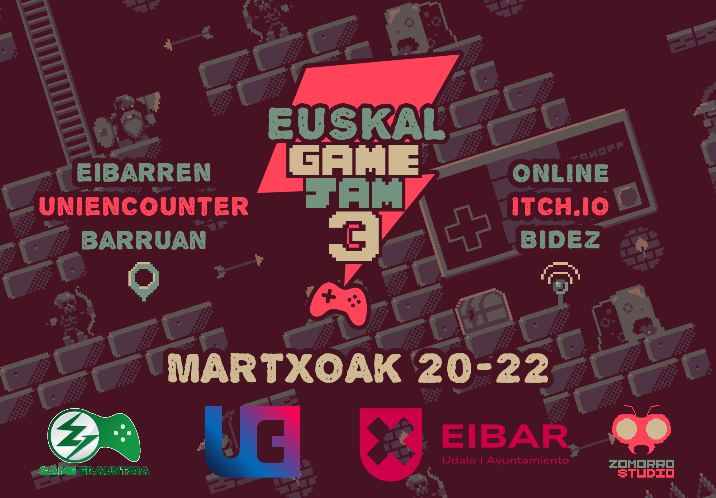Euskal Game Jam 3 topaketa asteburu honetan izango da, martxoaren 20tik 22ra, Eibarren. Aurreko urteetako bilkuretan bezala, euskarazko bideojokoen garapena bultzatuko dute antolatzaileek, Game Erauntsia Elkarteak eta Zomorro Studio taldeak, aurtengoan Eibarko UniEncounter ekimenarekin bat eginez gainera.