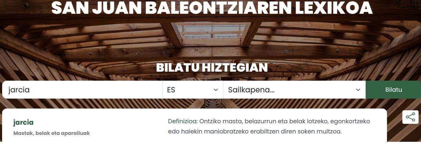Albaola elkarteak, Euskal Itsas Museoak eta UZEI zentroak 'San Juan' baleontziaren lexikoaren hiztegia argitaratu dute. Sarean, hemen. Albaola elkartearen lanen artean, San Juan baleontziaren erreplika egitea izan da ikusgarrienetakoa azken urteotan (orain uretan da itsasoan baleontzia, Pasaiako badian, lana osatu artean), baina kultur eragineko harduerak ere bultzatu dituzte, eta kasu honetan, euskarazko hiztegi bat prestatu dute beste erakundeen laguntzarekin.