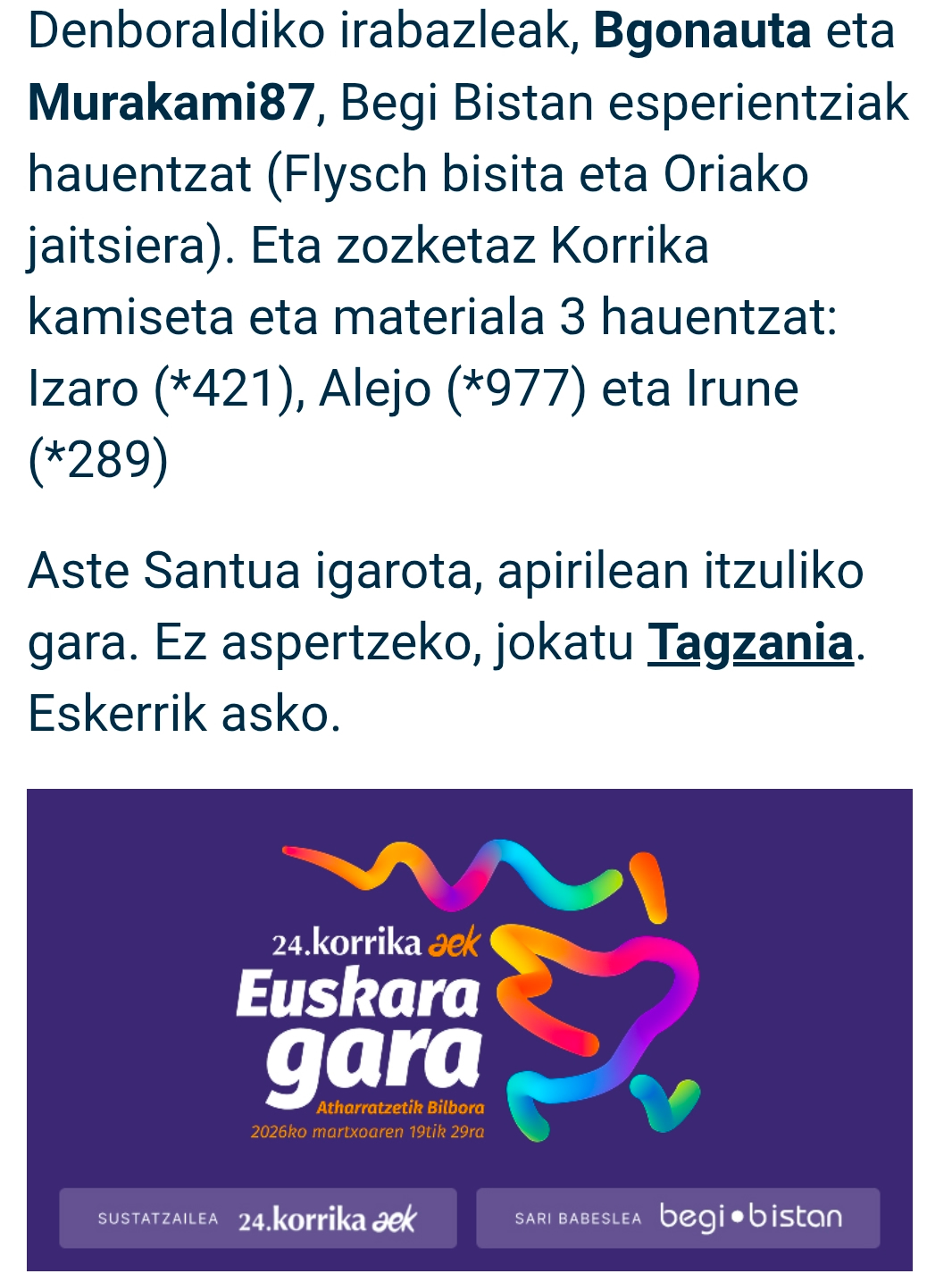 51.000 erabiltzaile izan ditu Egunean Behin jokoaren 20. denboraldiak, Korrikarekin batera igandean amaitu zenak. Aurreko denboraldian baino gutxixeago, ba hura 13. asteko denboraldia izan zen, eta aurtengo hau 8 astekoa. izatez, 40.000 jokalari astero, aurreko denboraldian astero izandakoak baino gehiago izan dira. Eskerrik asko jokalari guztiei, eta baita AEK/Korrika eta Begi Bistan babesleei.