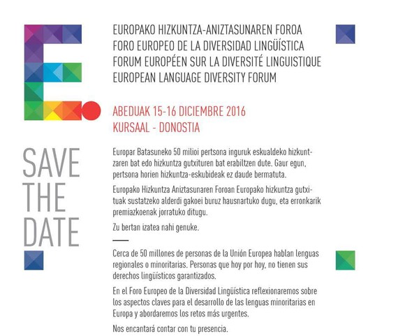 Horren harira, UNESCO Etxeak, Donostia-San Sebastián 2016 Fundazioarekin elkarlanean, Hizkuntza Aniztasunaren Europako Foroa antolatu du. Donostian egingo da, abenduaren 15ean eta 16an, eta Europako gizarte zibileko eragileak, erakundeak eta adituak bilduko ditu; baita ikerketa eta kulturaren munduko erakundeak eta gobernu-erakundeak ere. Bertan, Europako hizkuntza gutxituen garapenean eragiten duten alderdiei buruz hausnartuko eta eztabaidatuko dute.